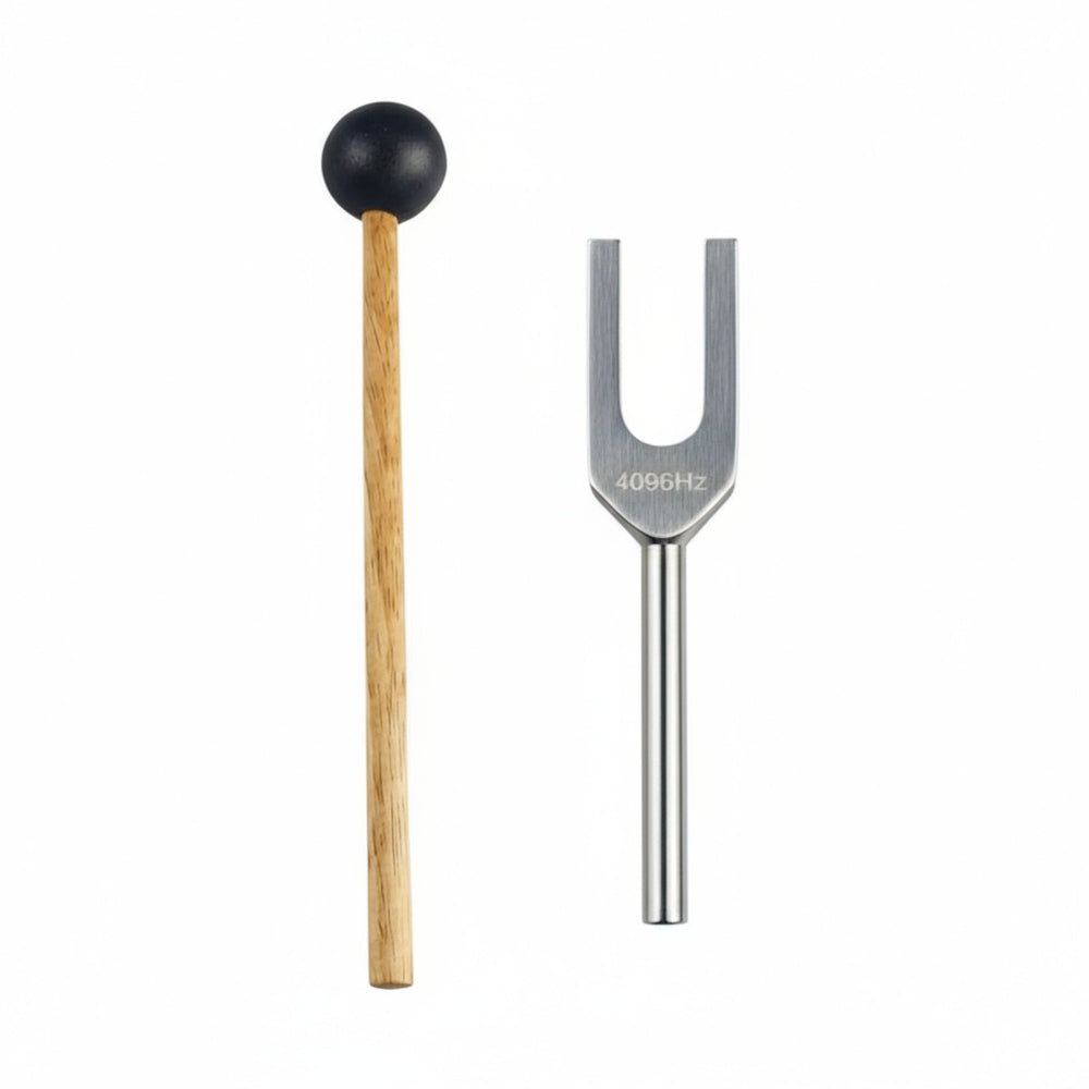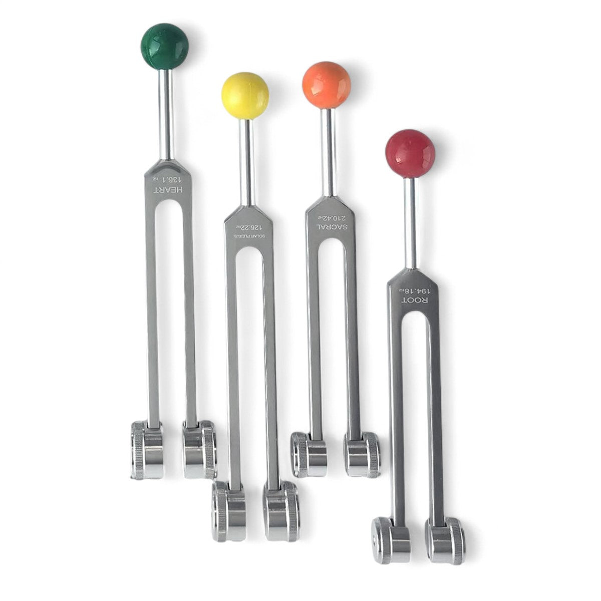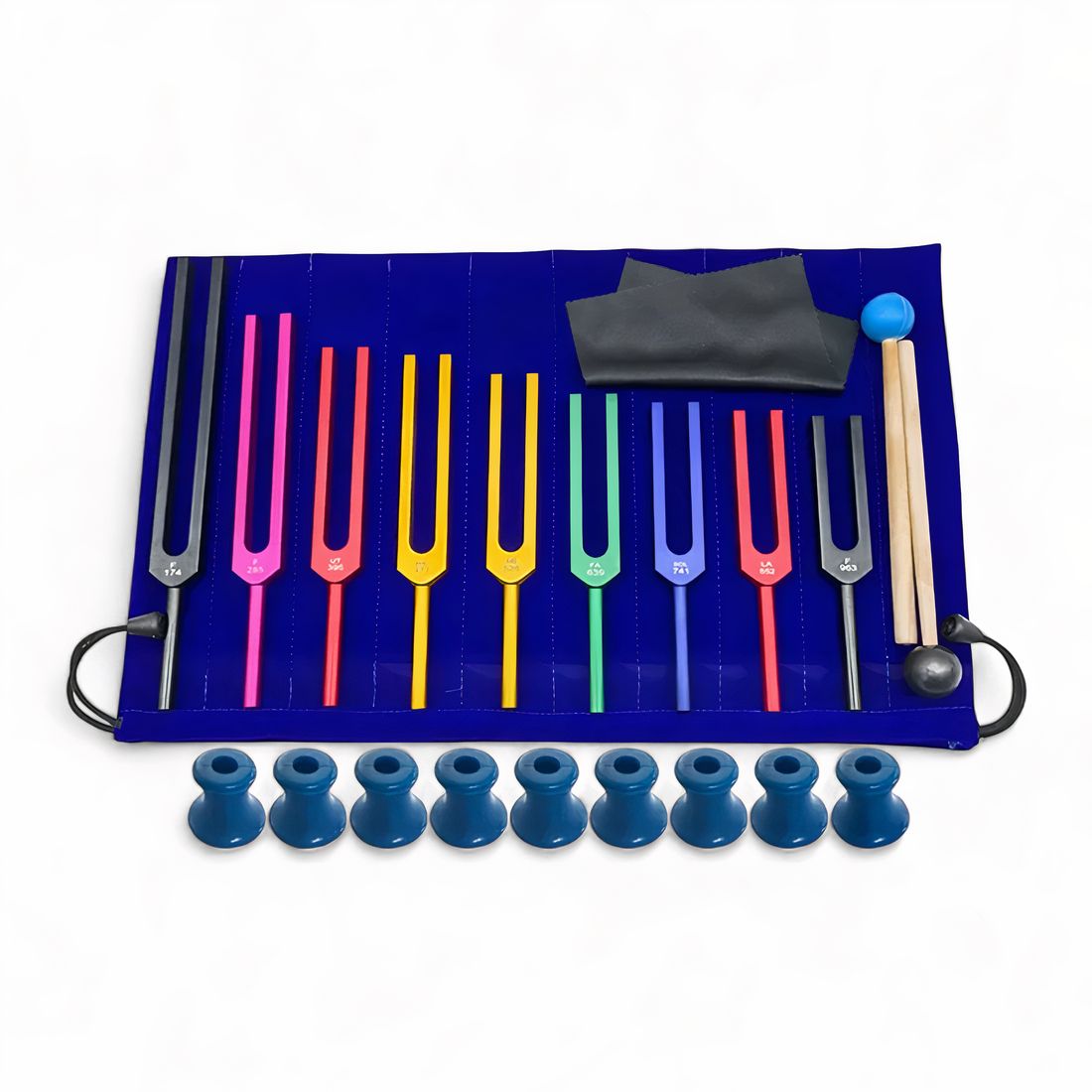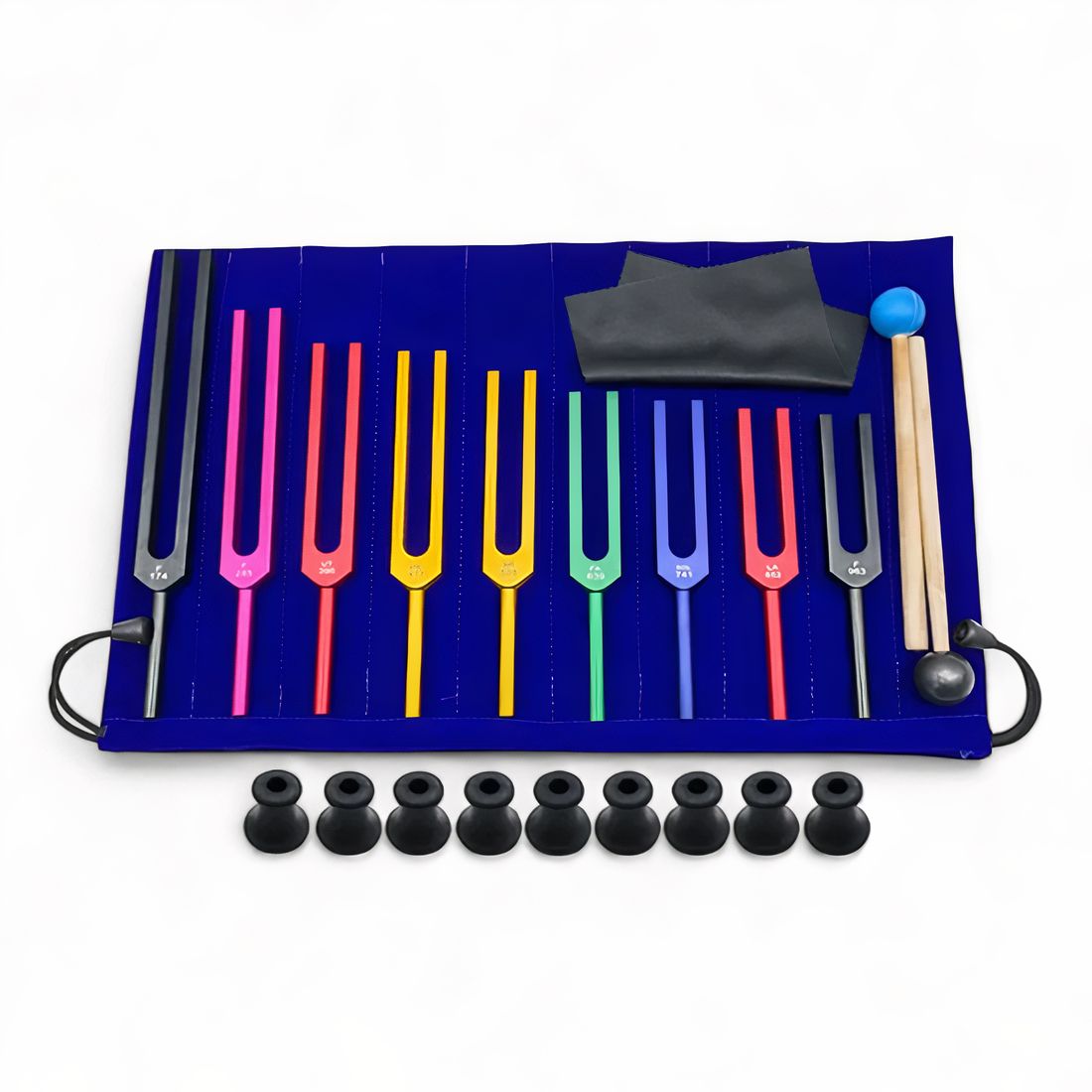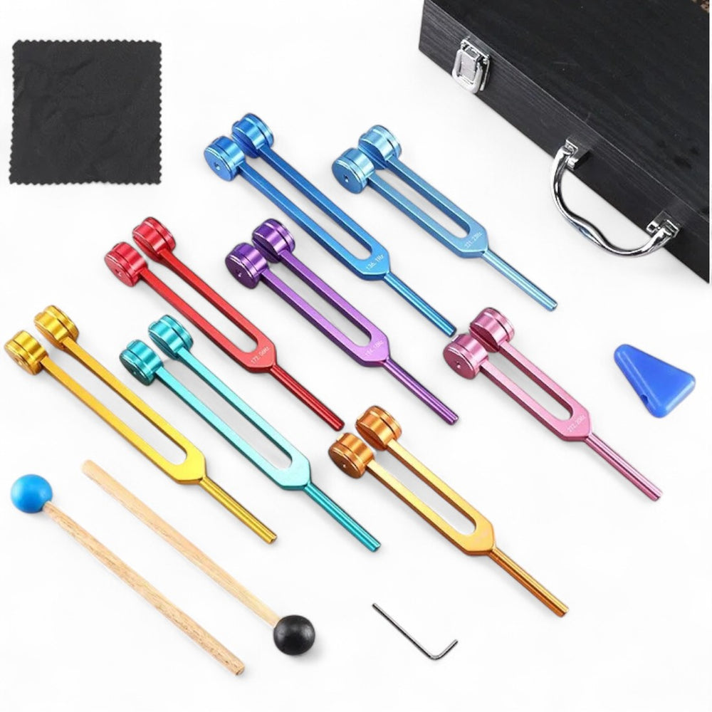 Set de 8 diapasons lestés en aluminium argenté avec embouts colorés,avec un maillet bois, une clé hexagonale, un chiffon noir, un socle d’activation et pochette écrue ; sur fond blanc